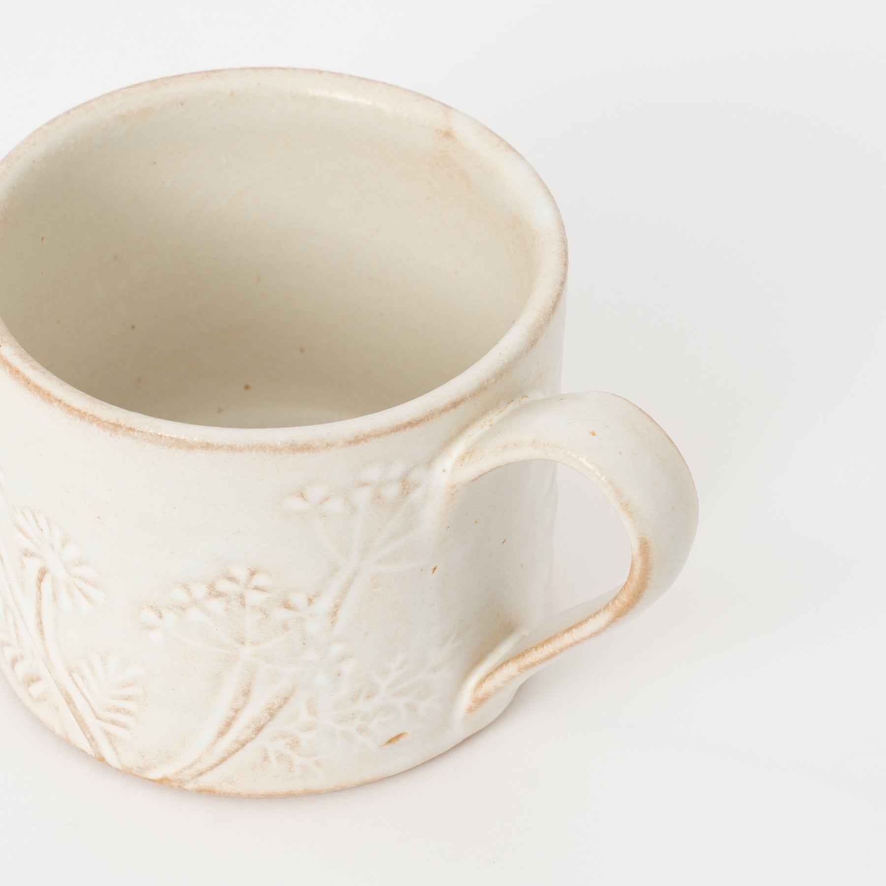 Japanese stoneware mug with embossed floral pattern for coffee and soup