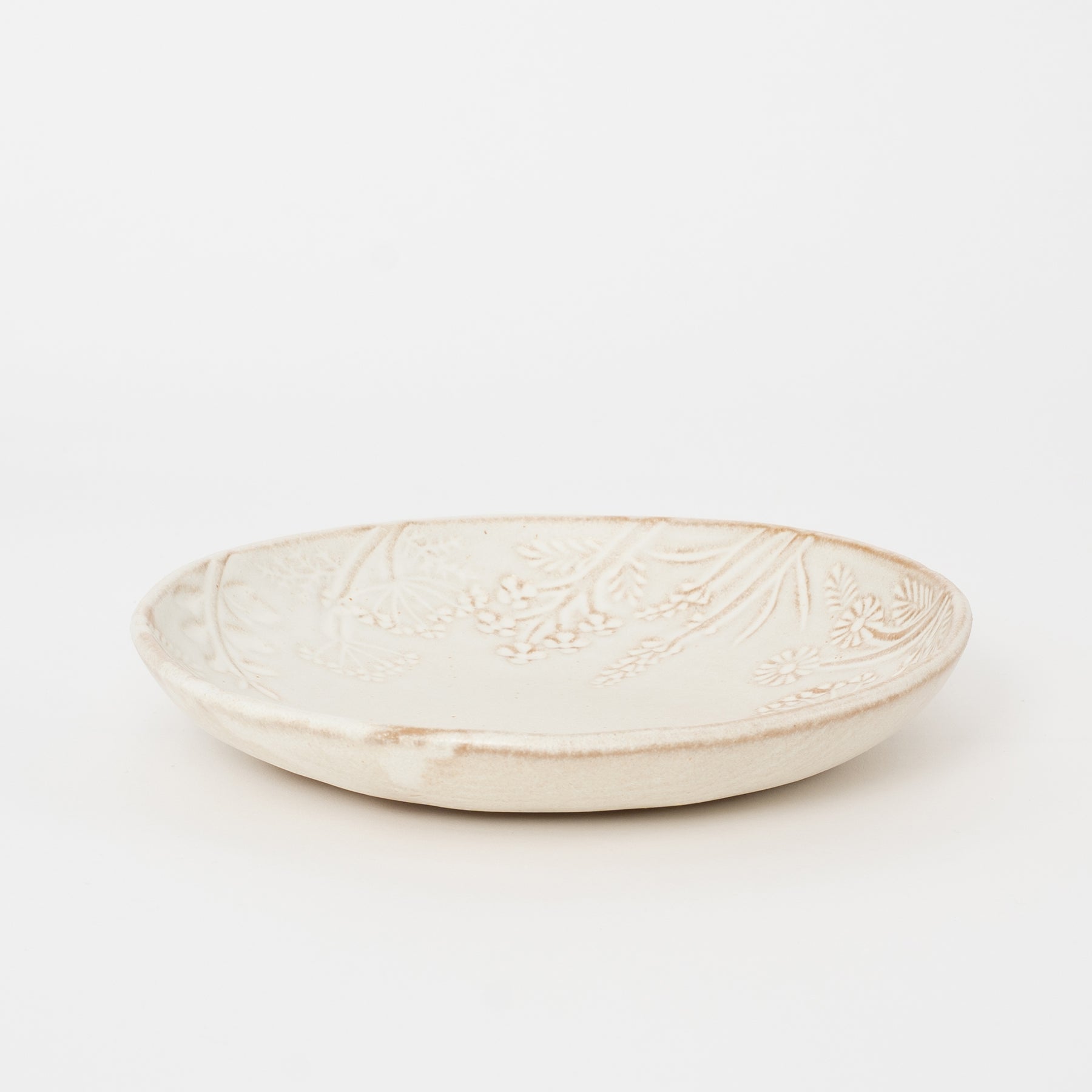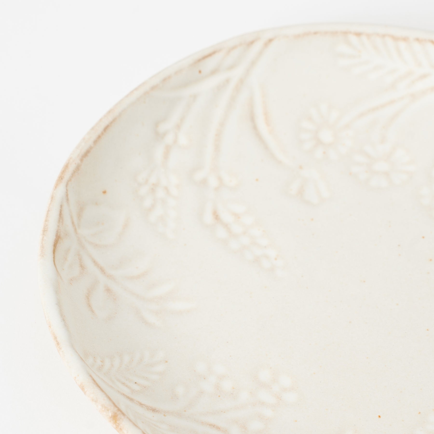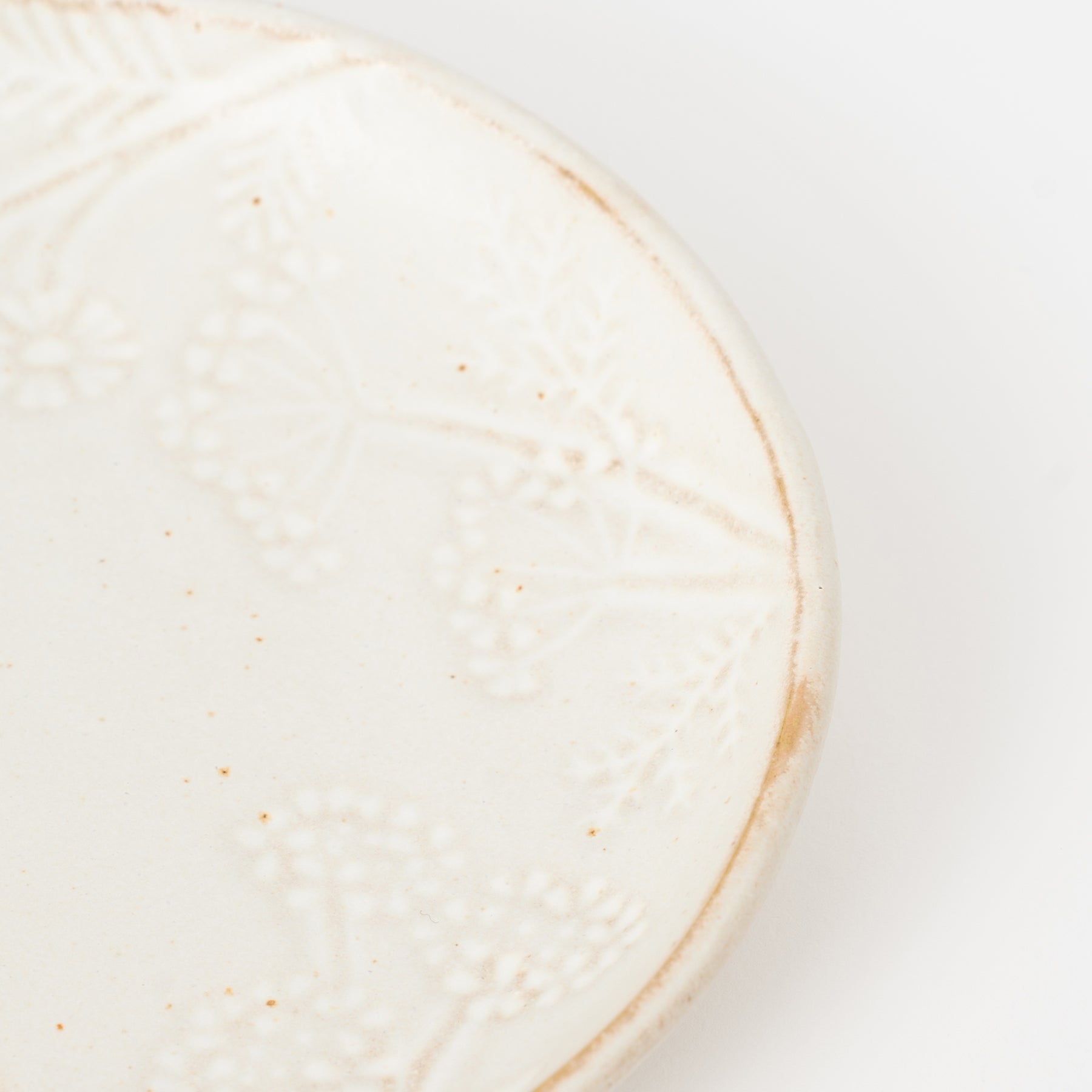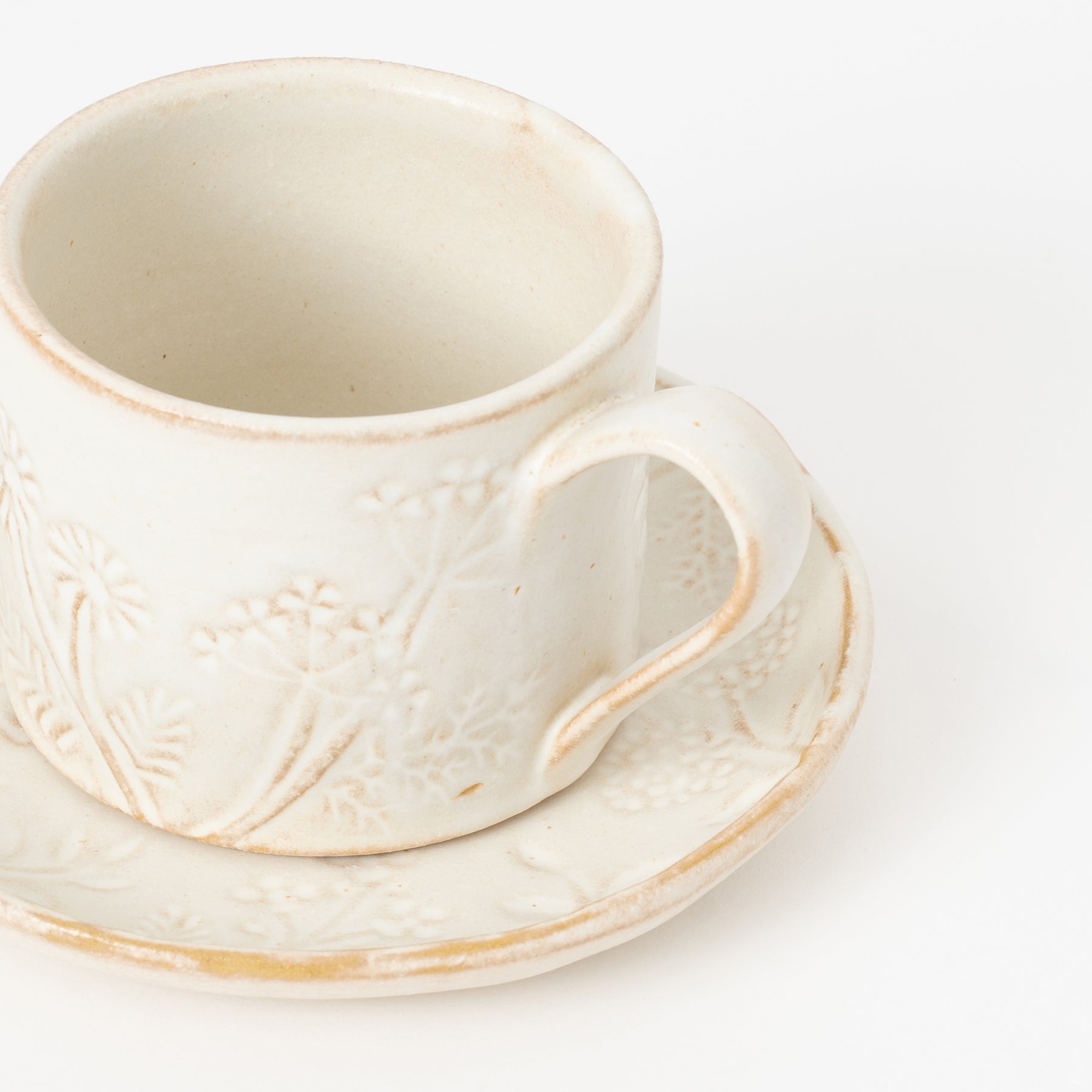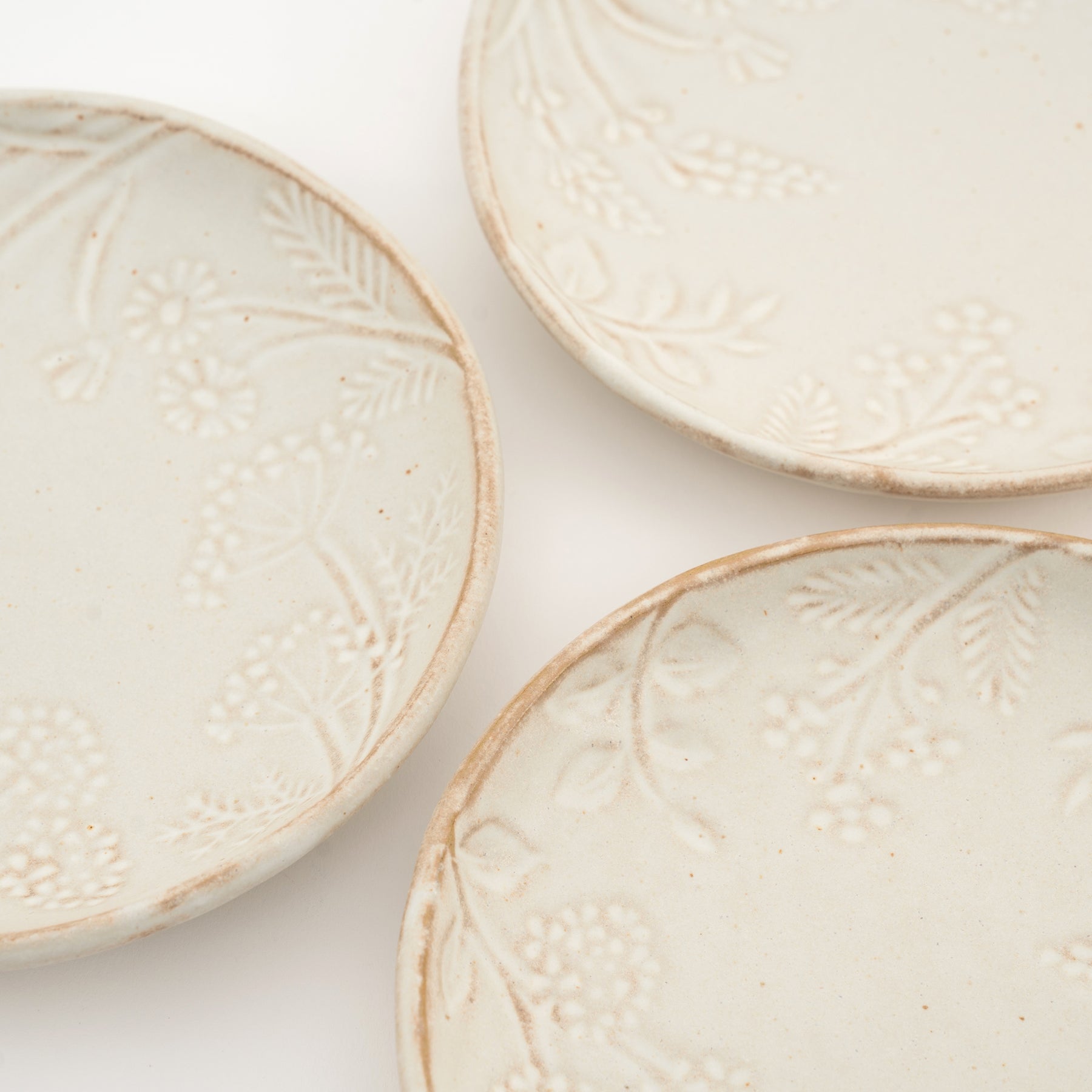 The collection includes a mug, a small plate, and a large plate, all sharing the same soft ivory glaze and delicate embossed floral pattern inspired by wild plants and seasonal flowers.