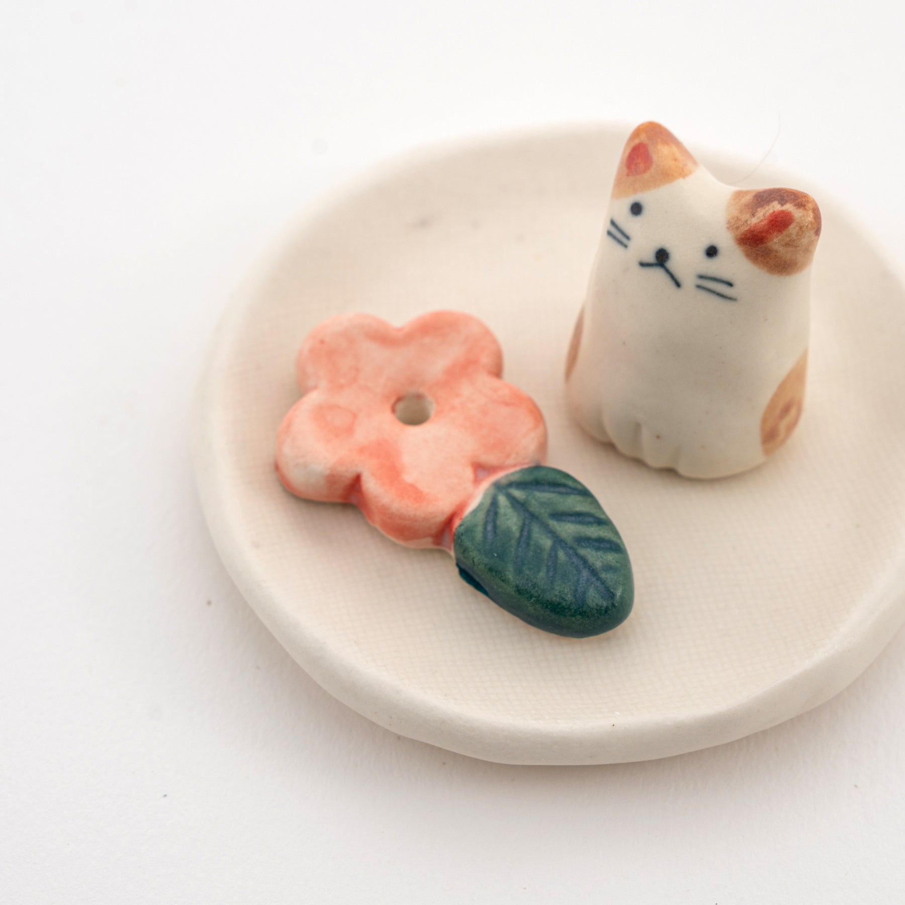 Handmade Japanese ceramic cat incense holder set with tray for stick and cone incense