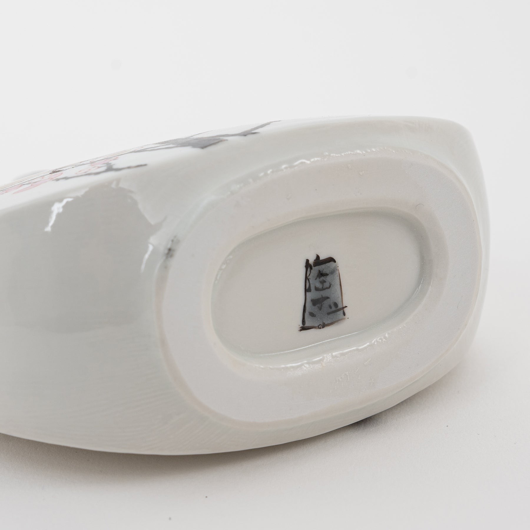 The softly contoured porcelain form becomes a living canvas where delicate plum branches bloom and the small bird rests with lifelike warmth. Nakamura’s brushwork captures movement and personality with remarkable sensitivity, preserving the spontaneity of traditional Kutani painting. Each vase is painted entirely by hand, making every piece uniquely expressive.