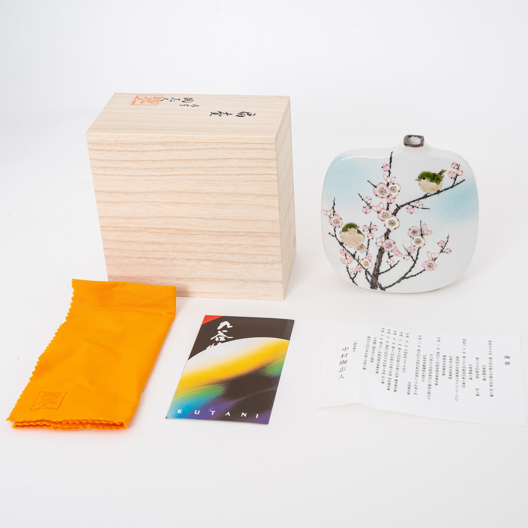 A poetic celebration of early spring, this Kutani ware art vase by acclaimed ceramic artist Nakamura Toshito features hand-painted plum blossoms and a bush warbler — a beloved seasonal motif in Japanese art symbolizing renewal and quiet beauty.