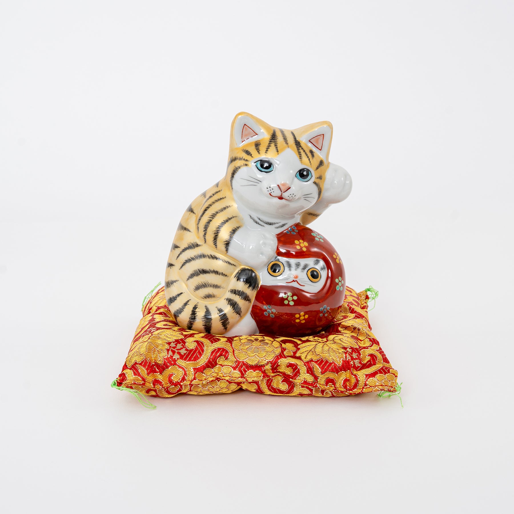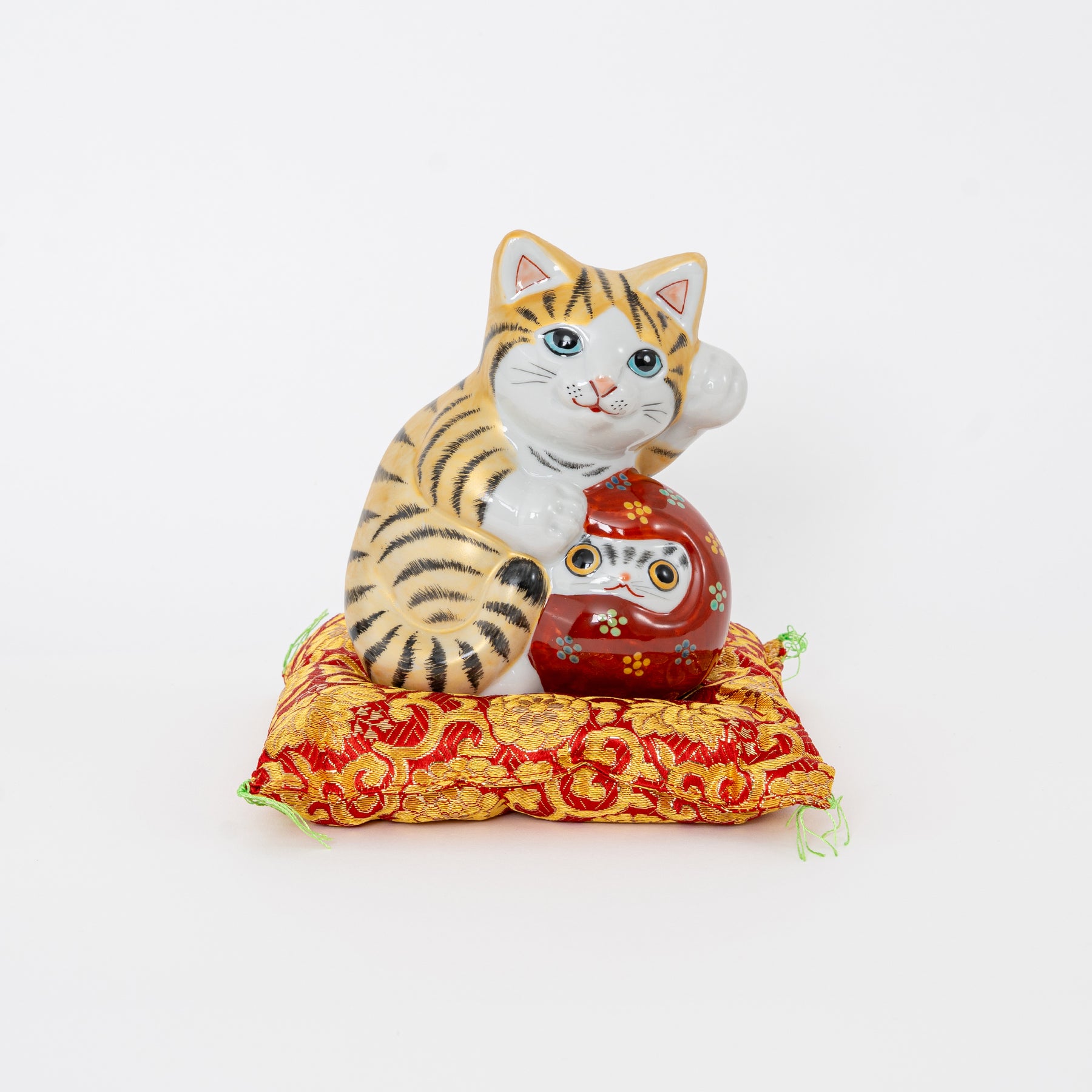 Each figurine is hand-painted with the vibrant colors and glossy finish Kutani ware is celebrated for. The playful cat gently embracing the Daruma creates a joyful scene that symbolizes encouragement, prosperity, and new beginnings. Displayed on its decorative cushion, it becomes an eye-catching accent for your home, office, or gift table.