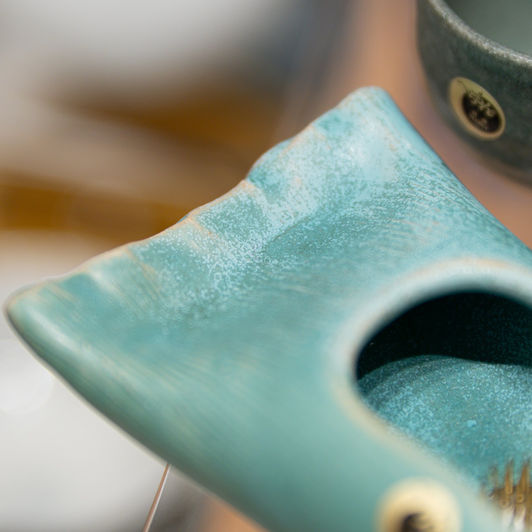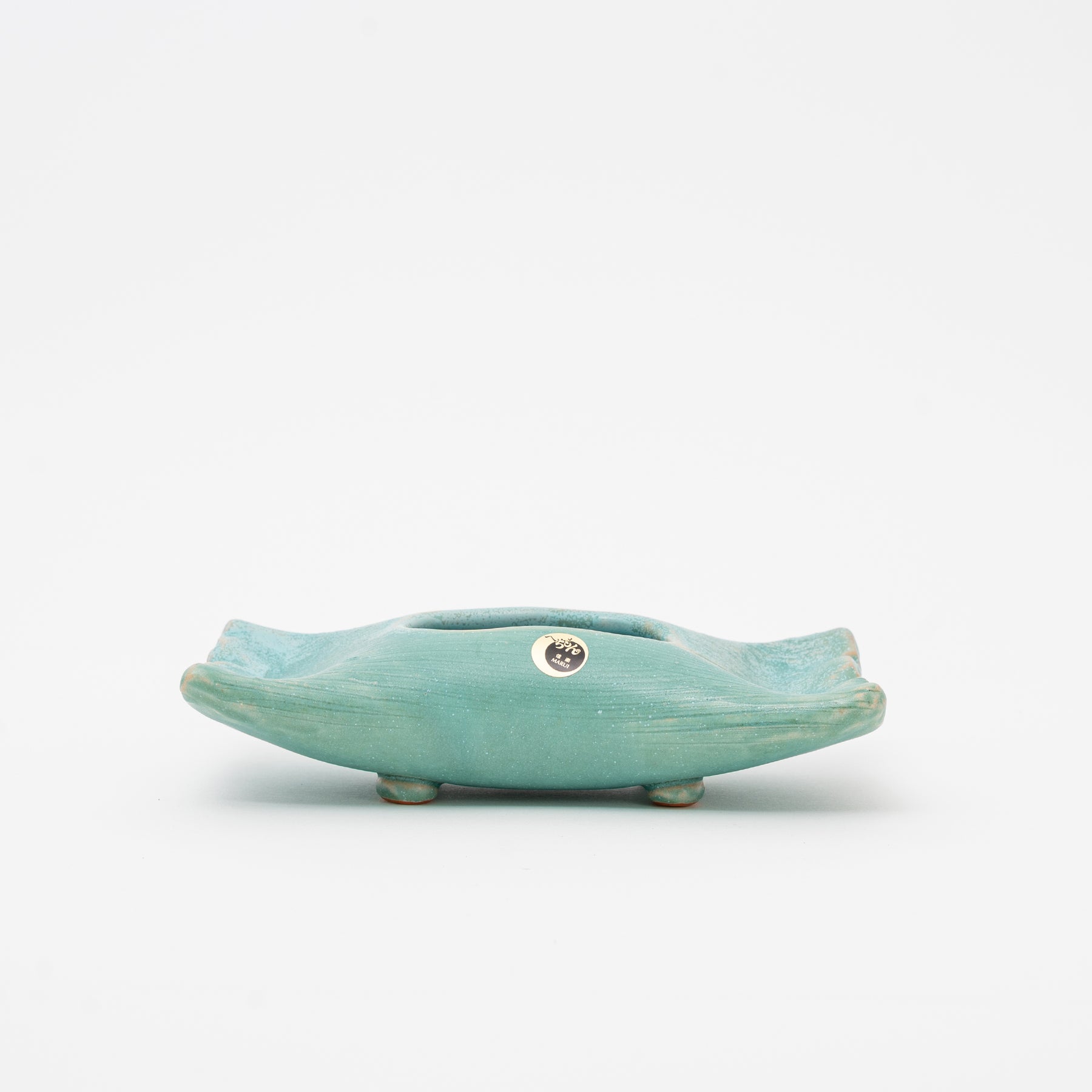 Introduce a focal point of tranquility to your contemporary space with this unique Shigaraki ware (信楽焼) boat-shaped vase. Its elegant, low-profile design utilizes a striking Teal/Aqua glaze that is rich in natural texture and spontaneous variations, echoing the serenity of still water and embodying the essence of the Wabi-Sabi aesthetic.