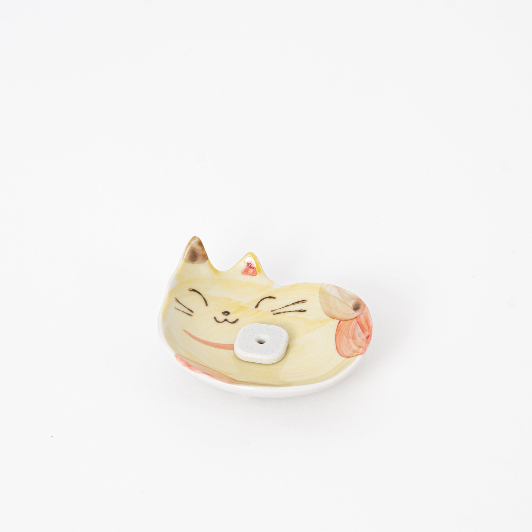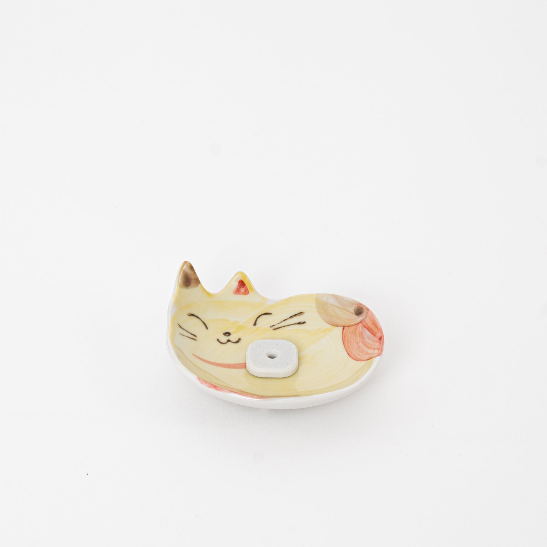 Bring a touch of playful Japanese charm to your daily rituals with this handmade ceramic cat incense holder, crafted in Japan. Shaped like a relaxed smiling cat, this piece blends kawaii design with thoughtful functionality.
