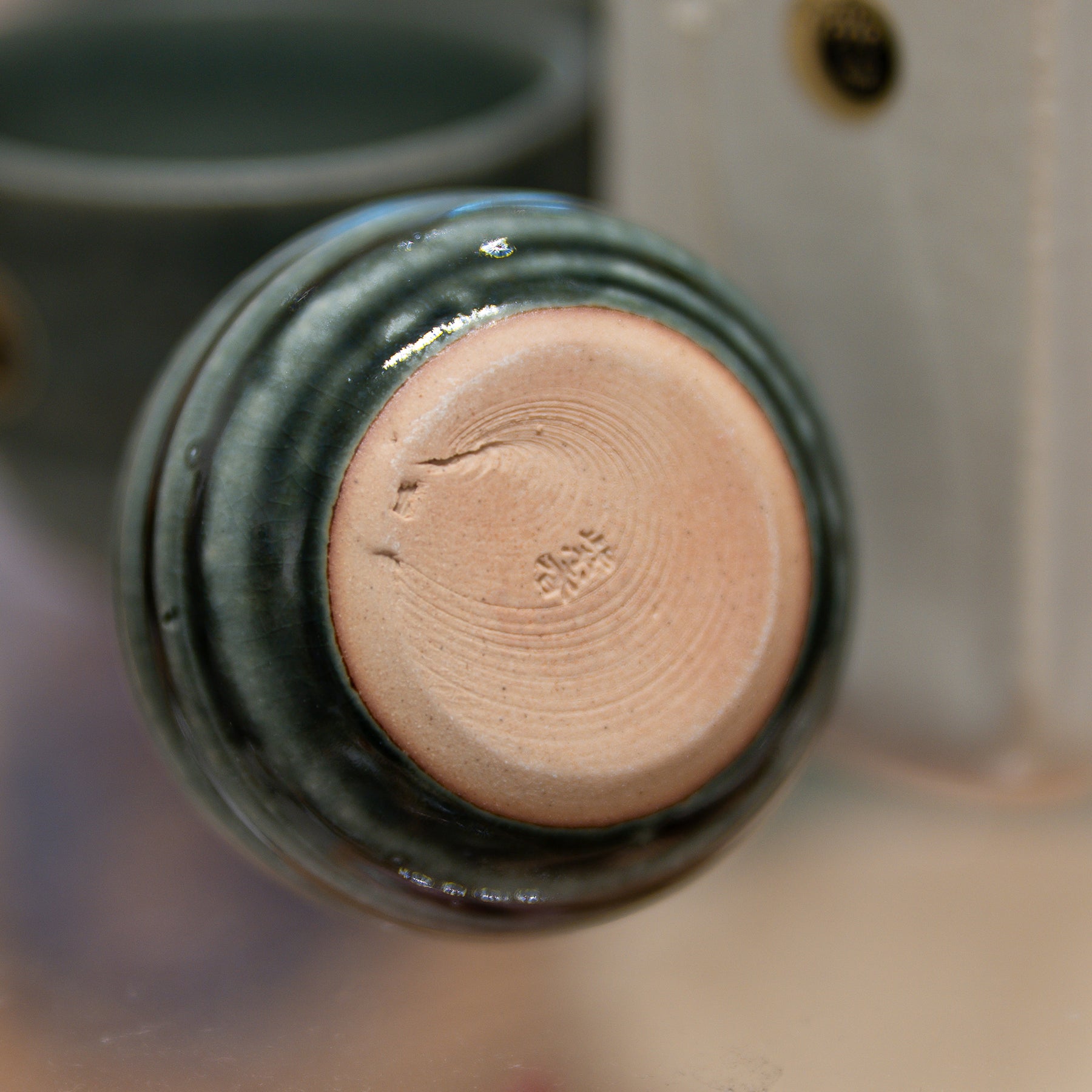 Close-up of the opening and dark teal bronze glaze texture on Shigaraki ceramic mini vase