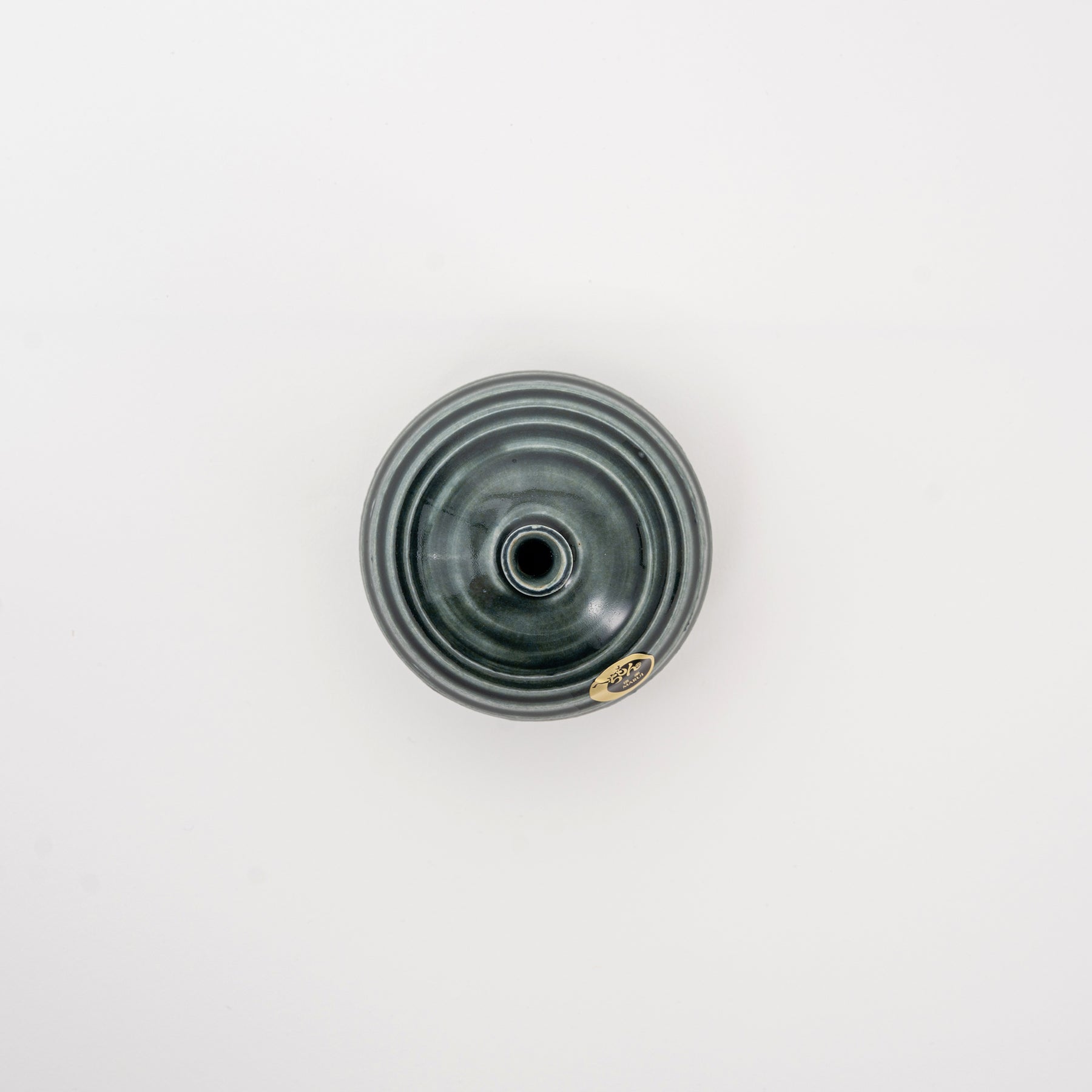 Standing at approx. 8 cm in height (about 3.15 inches), this compact vase features a captivating, deep teal/bronze glaze. The distinctive horizontal banding creates a stunning "vortex" effect, showcasing the artistry of the craftsman and the inherent beauty of the clay.