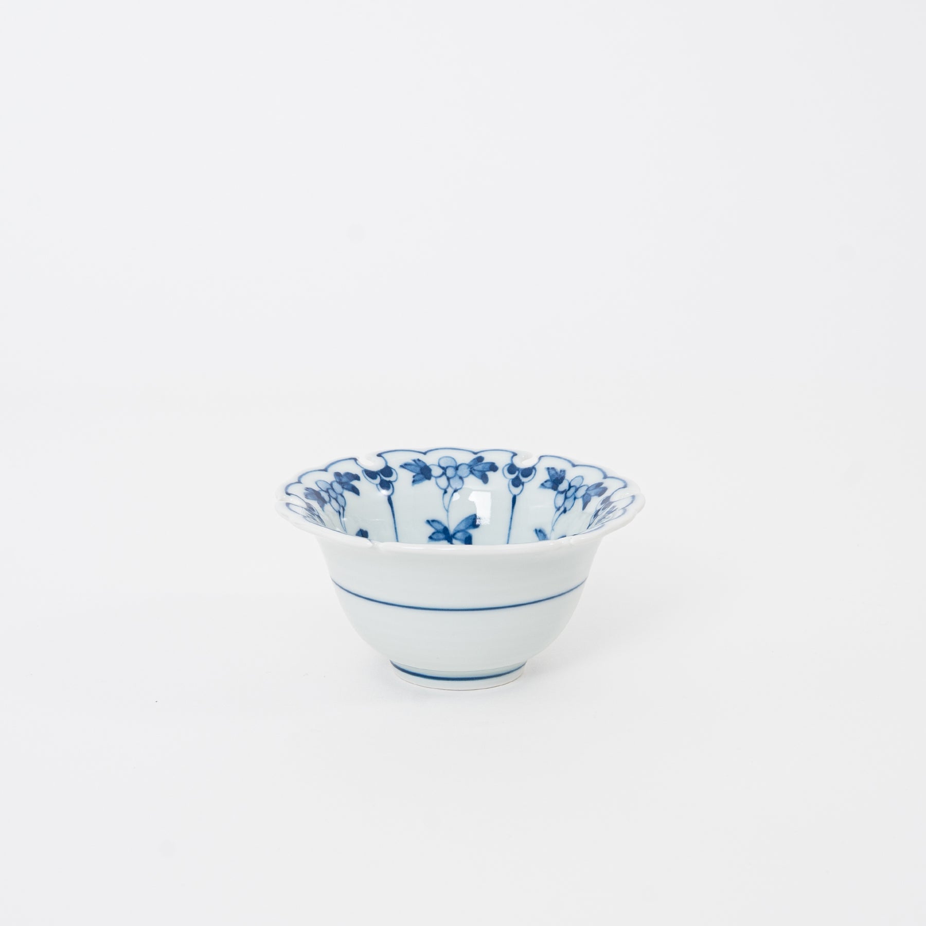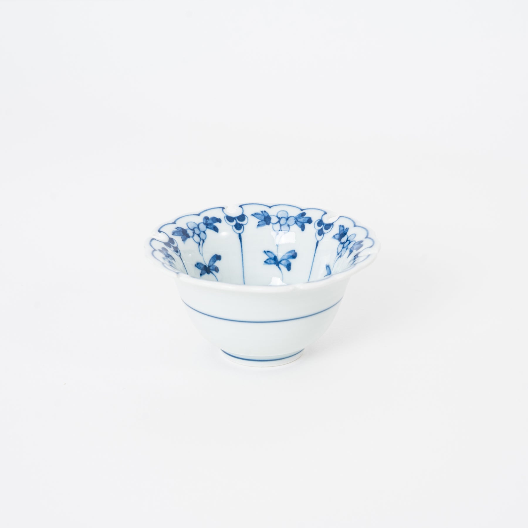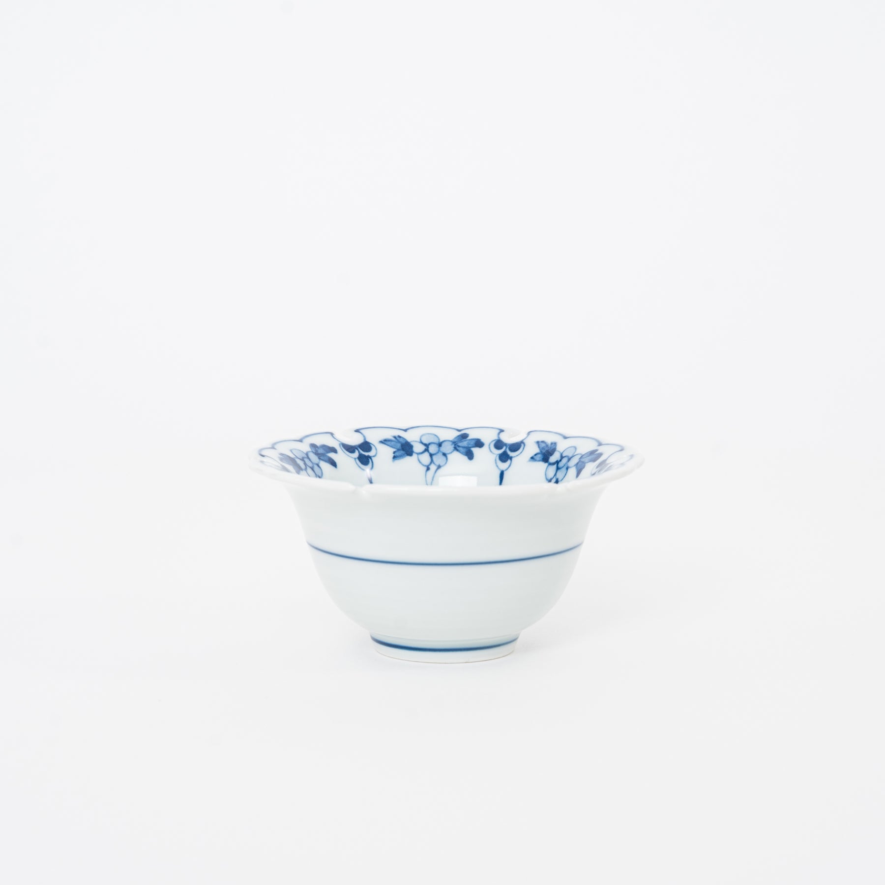 Side profile of a 3.75 inch Japanese porcelain mini bowl showing the elegant tapered shape and blue striped base design.