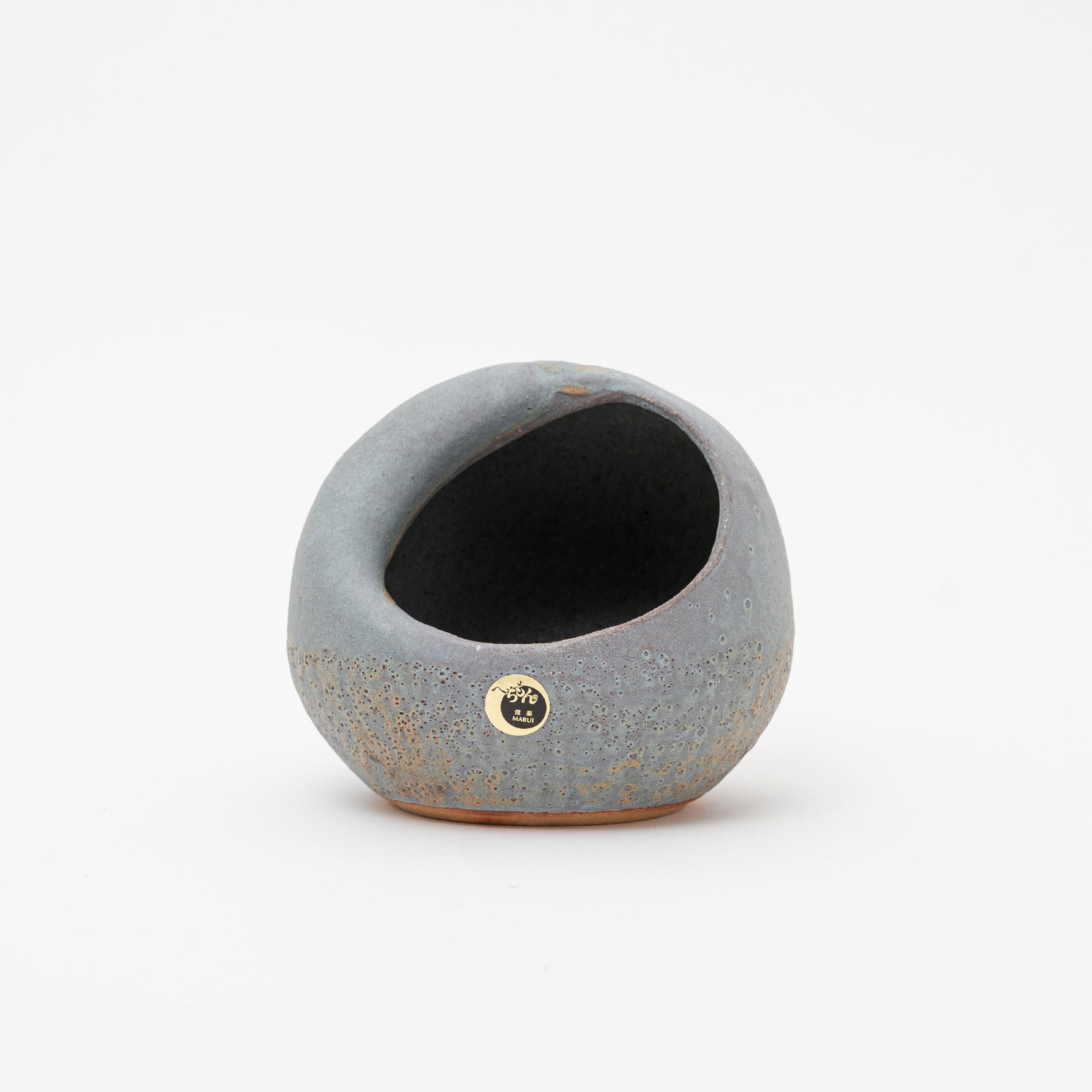 Embrace the serene imperfections of Wabi-Sabi with this extraordinary Shigaraki ware (信楽焼) vase. Rejecting sharp angles, this piece boasts a soft, organic orb shape with a uniquely placed, asymmetrical opening. The rough, matte ash-grey glaze features natural, earthy accents of rust and bronze, capturing the spontaneous beauty characteristic of this ancient Japanese kiln.