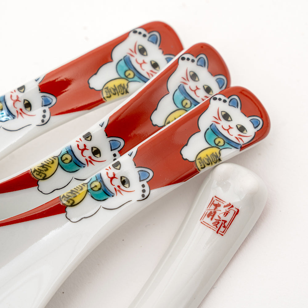 Maneki-Neko Design: Features adorable lucky cat patterns on the handle and spoon bowl, symbolizing good fortune.